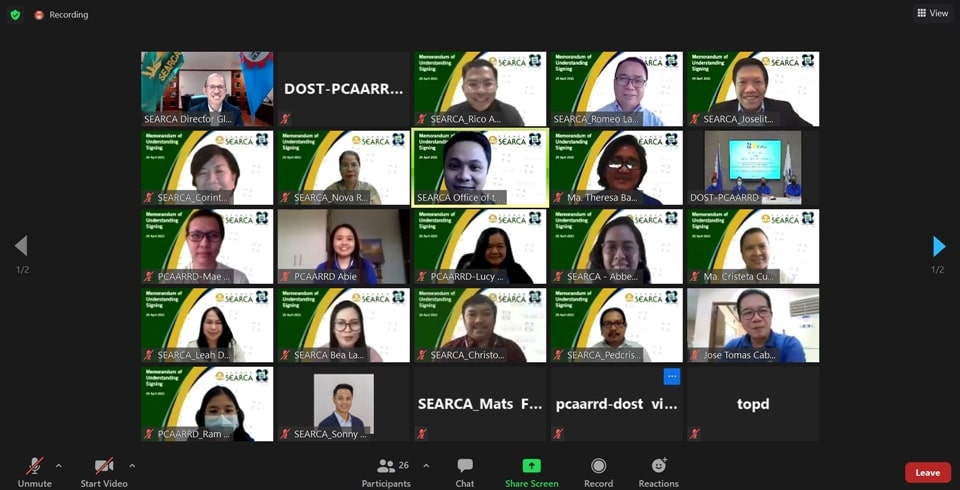 “We recognize the important role of PCAARRD in the Philippines and beyond in sustaining dynamic leadership in S&T to cultivate various platforms for AANR,” SEARCA Director Dr. Glenn B. Gregorio said during the virtual ceremonial signing of the memorandum of understanding between SEARCA and PCAARRD on 29 April 2021.